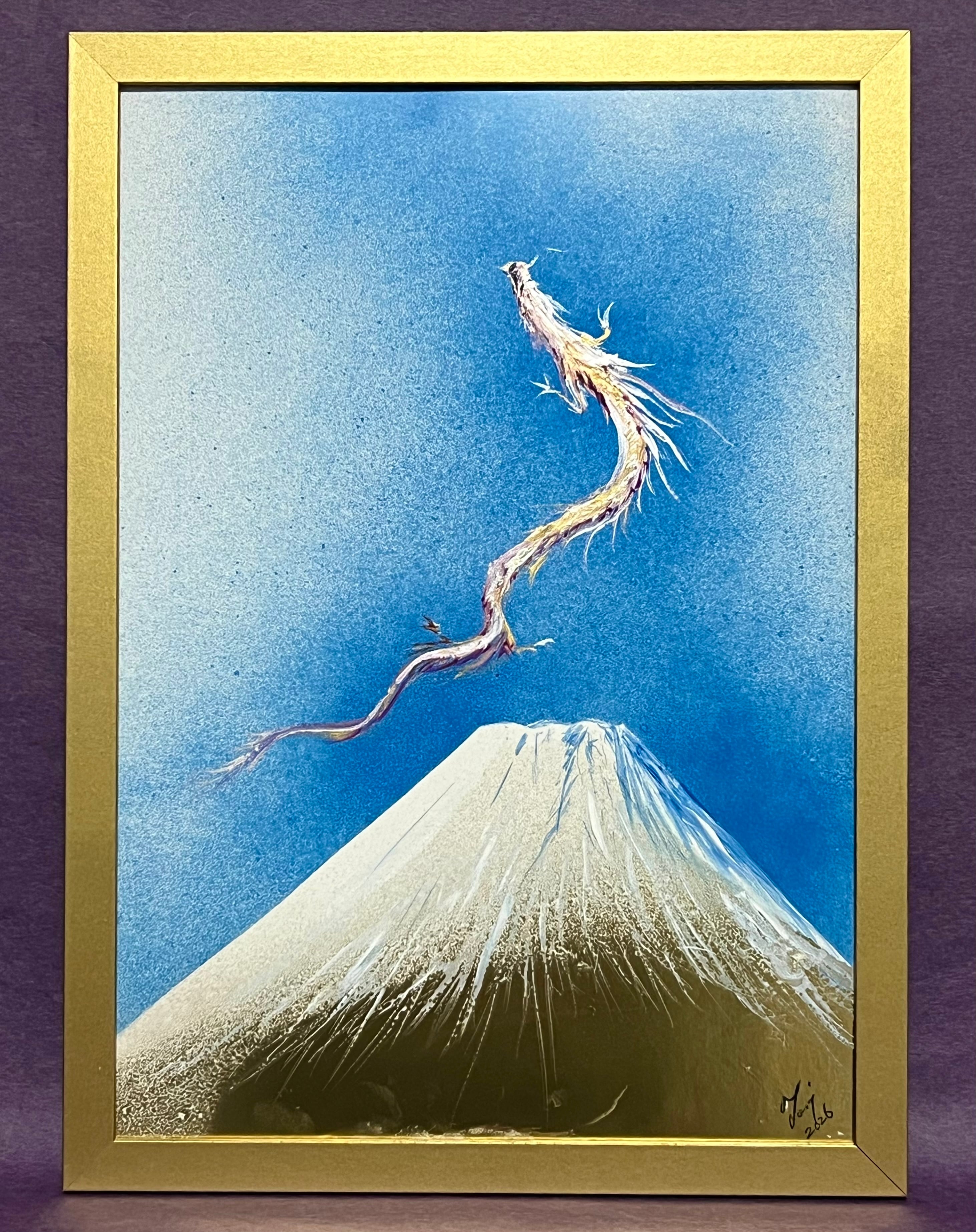 富士山と金龍様 オリジナル原画 A4サイズの額に入れ発送いたします。